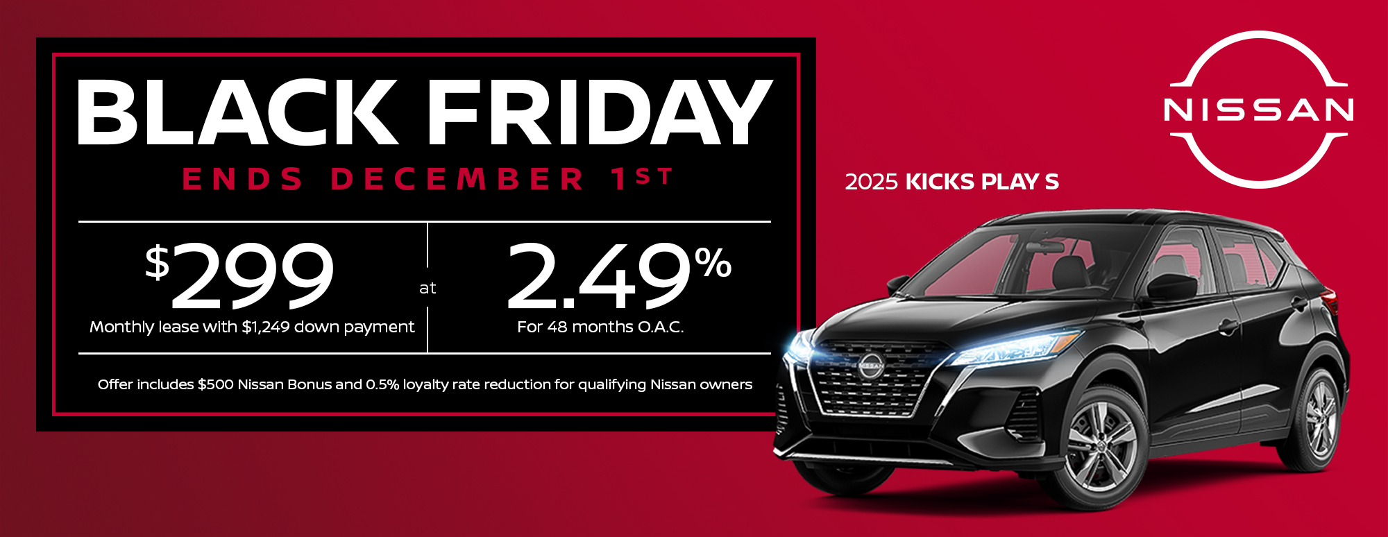 Selling price of 2025 KICKS Play S model shown is $24,991. Limited time lease or finance offers provided through Nissan Canada Finance, on approved credit. All prices and payments include $2,095 freight and PDE; $100 A/C charge; regulatory fees (up to $35); dealer administration fees (up to $621); PPSA fees (up to $139); as well as all other applicable fees, levies and duties (all of which may vary by region and retailer). License; insurance; registration; and applicable sales taxes are extra. Representative lease example: Selling price of KICKS Play S model is $24,973. Leased at 2.49% for 48 months equals monthly payments of $299. $1,249 down payment required. Cost of borrowing is $0 for a total obligation of $15,618. Total of 48 monthly payments required during the term. First monthly payment due at lease inception. 16,000-kilometre allowance; charge of $0.10/km for excess kilometres.