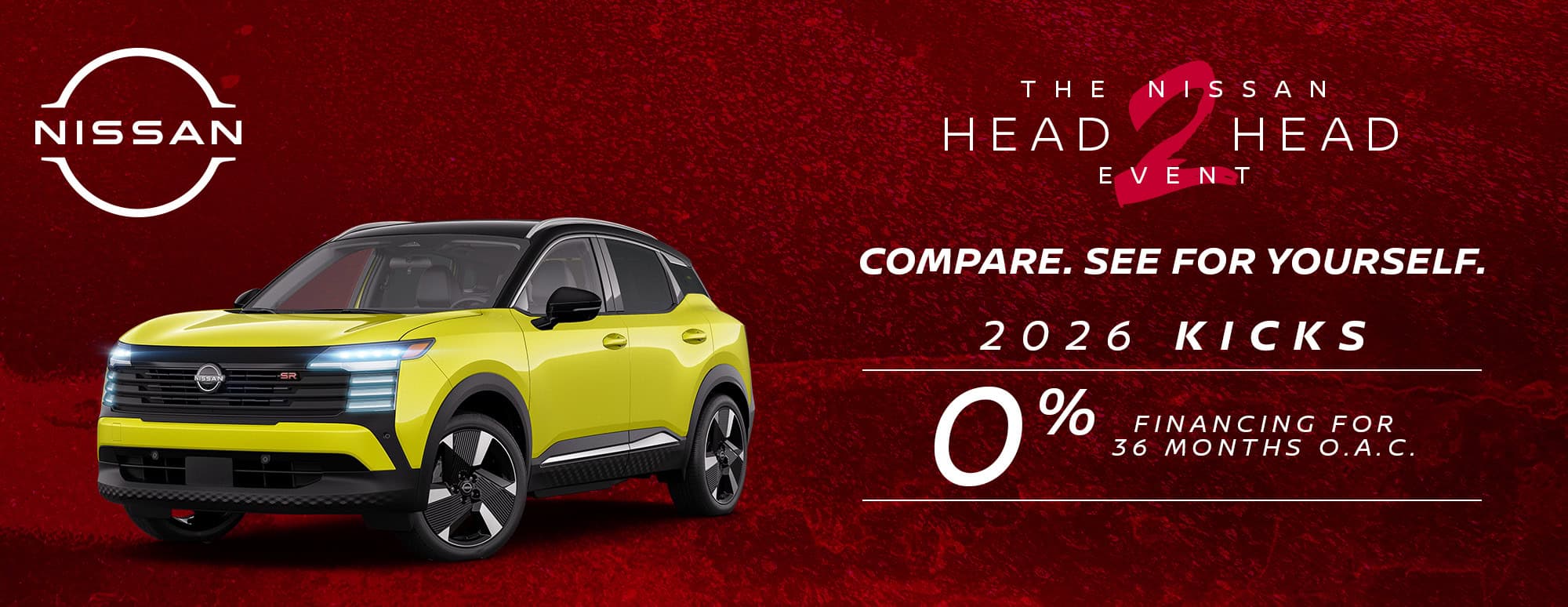 Selling price of new 2026 Kicks SR Premium is $38,280. Limited time finance offer provided through Nissan Canada Finance, on approved credit.  All prices and payments include $2,050 freight and PDE; $100 A/C charge; regulatory fees (up to $35); dealer administration fees (up to $621); PPSA fees (up to $139); as well as all other applicable fees, levies and duties (all of which may vary by region and retailer). License; insurance; registration; and applicable sales taxes are extra. Representative finance examples: selling price of 2026 Kicks SR Premium is $38,280. Financed at 0% for up to 36 months equal monthly payments of $1,063. $0 down payment required. Cost of borrowing is $0 for a total obligation of $38,280. Total of 36 monthly payments required during the term.